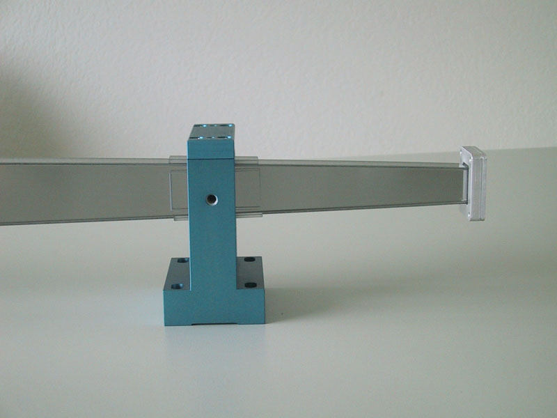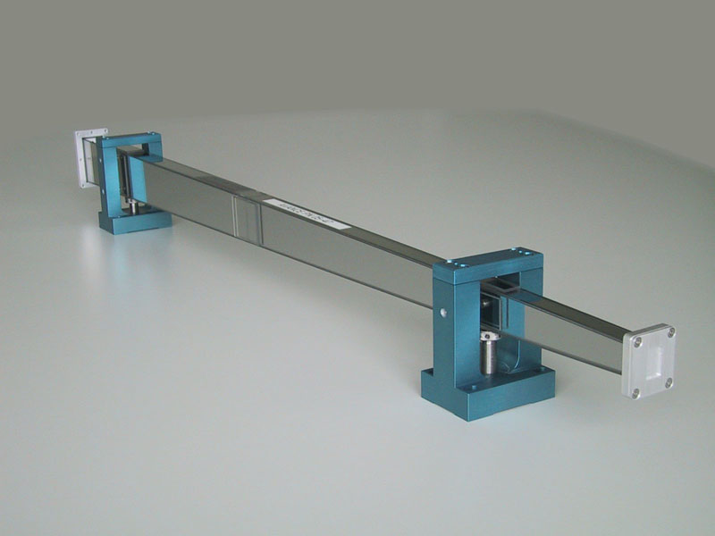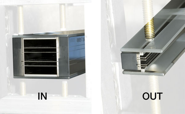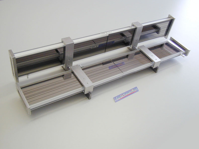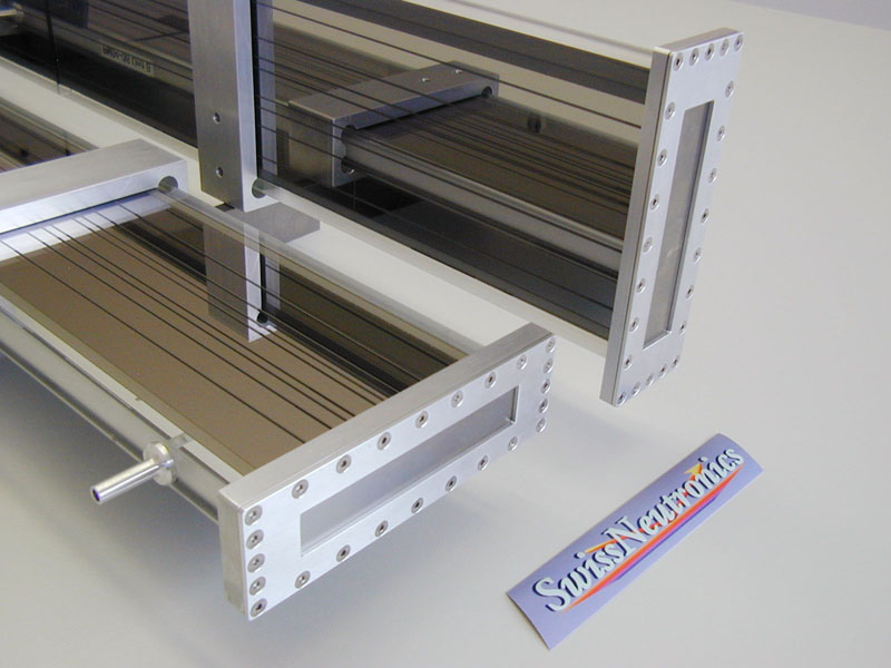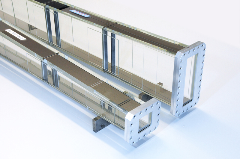 An optimized multi-channel parabolic guide focuses the neutron beam coming from the monochromator of the instrument StressSpec (FRM-II) to a small spot on the samples. The pictures below show the thin glass plates at the entrance and exit of the device. The narrow nose-pieces of the top/bottom plates at the exit have a width of only 2mm.