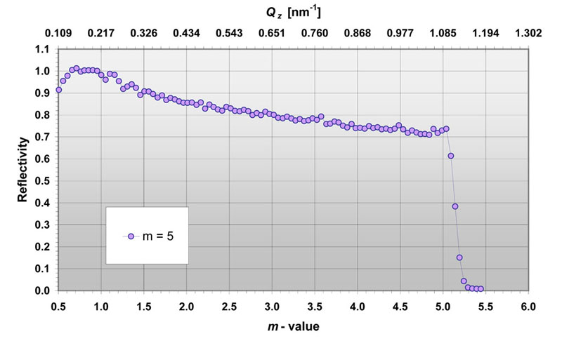 The non-linear tapered guide for the beamline TOPAZ is the first neutron optics with supermirror coatings m = 5. The highly sophisticated coating technology of SwissNeutronics enabled for an excellent performance with reflectivities between 68 and 72% at the critical edge of the supermirror measured on all substrates. The non-linear tapered guide profile was developed by the customer and realized with the “truly curved” concept (continuous curvature) by SwissNeutronics.