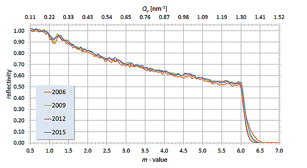 The following figures show representative reflectivity profiles of various supermirrors prepared on floated glass, super-polished Borkron glass and metallic substrates: